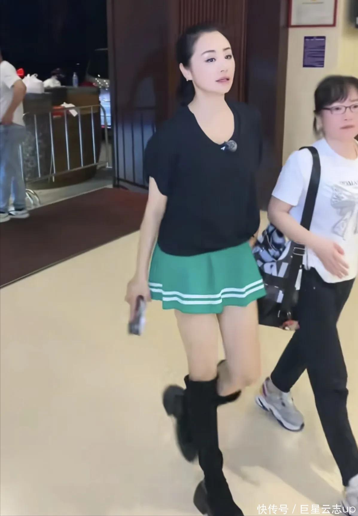 只见在网友拍到的路透照中,51岁的曹颖上半身穿着黑色短T恤,下半身穿着绿色小短裙,脚踩长筒靴,这状态哪像51岁的人啊,说她说是在校大学生都有人信吧。